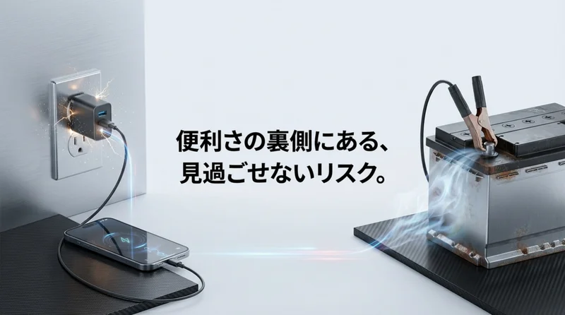 しかし、どんな充電器でも良いわけではありません。間違った製品や使い方をすると、過充電によるバッテリーの破損や火災のリスクがあります。